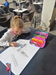 1°Classificato: Fatima Isabella Sy. Scuola “Miani”. “Per un racconto grafico-pittorico, in cui la sintesi spaziale diventa anche memoria di alcune significative architetture rodigine”.