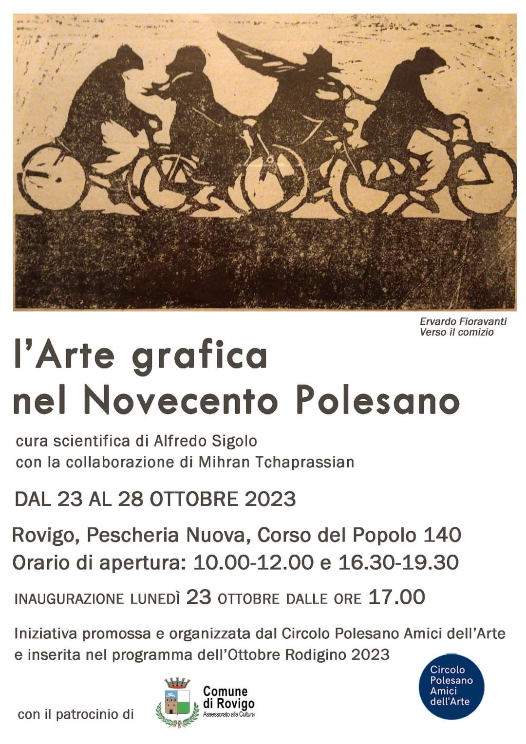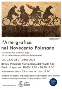 Nell’ambito del programma di manifestazioni dell’Ottobre Rodigino 2023, il Circolo Polesano degli Amici dell’Arte, presidente Federica Panziera, ha promosso una serie di eventi in Pescheria Nuova, Corso del Popolo 140, Rovigo. L’inaugurazione fissata per lunedì 23 ottobre alle ore 17.00, alla presenza delle autorità cittadine, si aprirà con una mostra dal titolo “L’ Arte Grafica nel Novecento Polesano” con la curatela scientifica di Alfredo Sigolo e con la collaborazione di Mihran Tchaprassian, che si configura come una rassegna sulla produzione grafica d’arte in Polesine attraverso il secolo scorso, fino ai nostri giorni. Nella sede espositiva sarà allestita una significativa selezione di opere di artisti del nostro territorio che si sono espressi con particolare efficacia nelle tecniche artistiche a stampa, che hanno origini nobili e antichissime.
