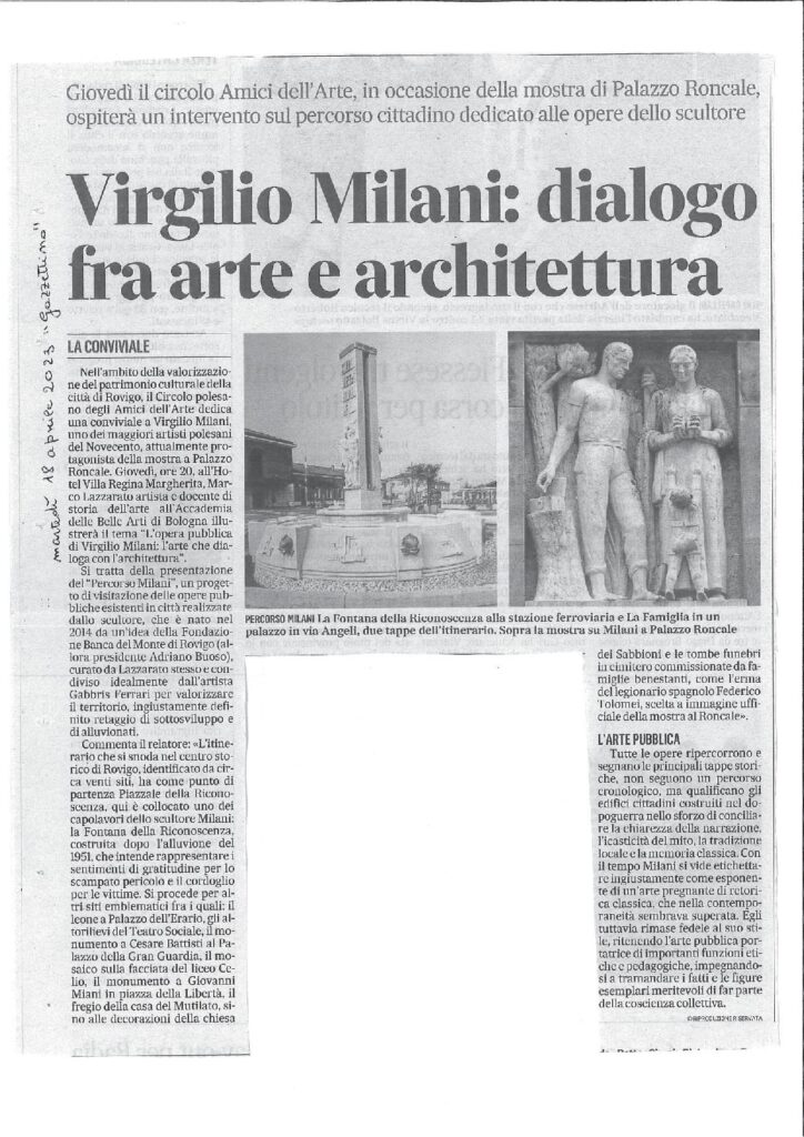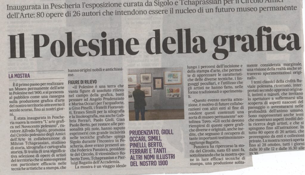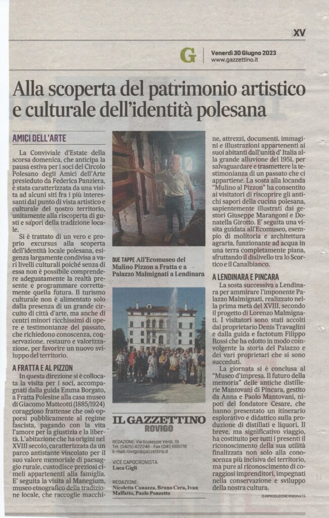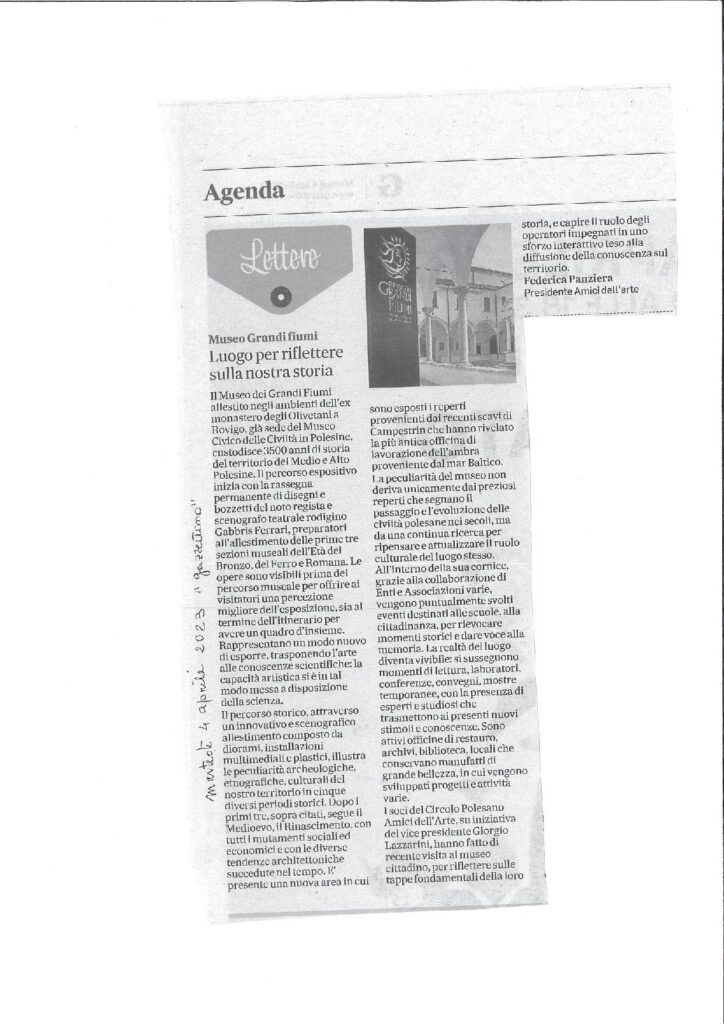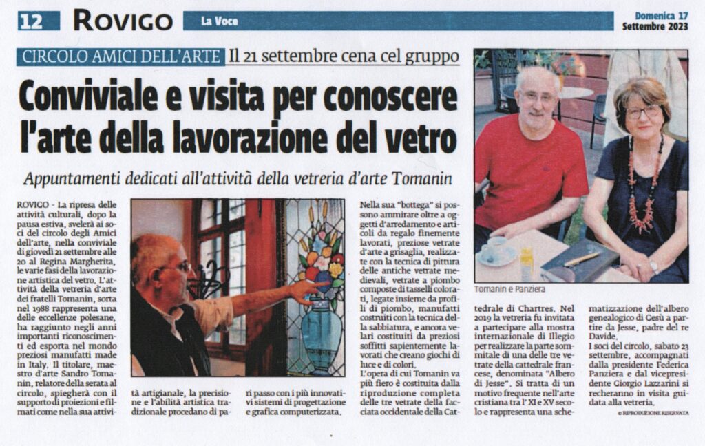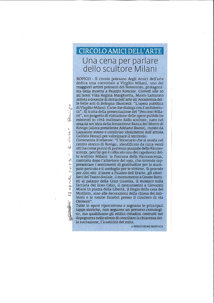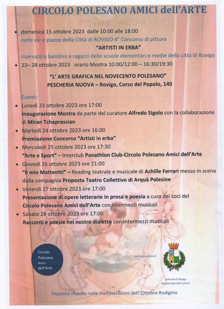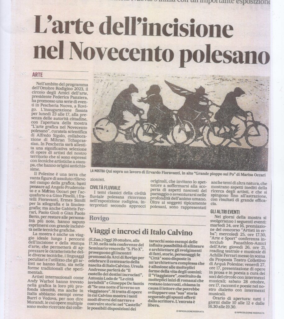 26-06-2023 Rovigo oggiConviviale di settembre 2023 “L’arte del vetro”. Relatore il maestro Sandro Tomanin- La Voce di RovigoLocandina della Mostra del Circolo Amici dell’Arte – ottobre 2023Presentazione della Mostra dell’ottobre rodigino. Pescheria Nuova Titolo “L’Arte grafica del Novecento Polesano. Curatore Alfredo Sigolo. Gazzettino