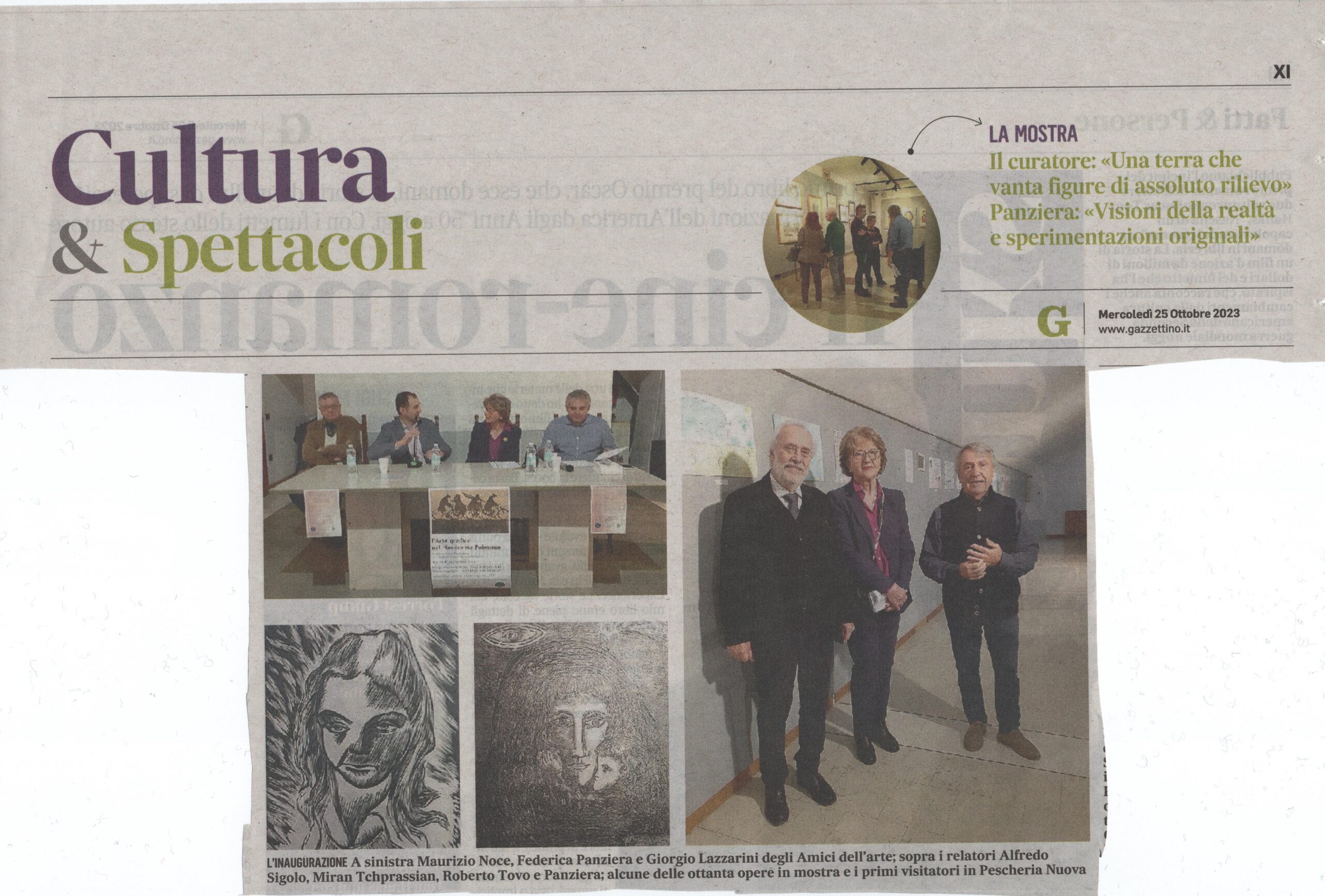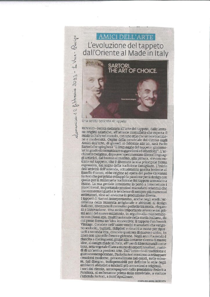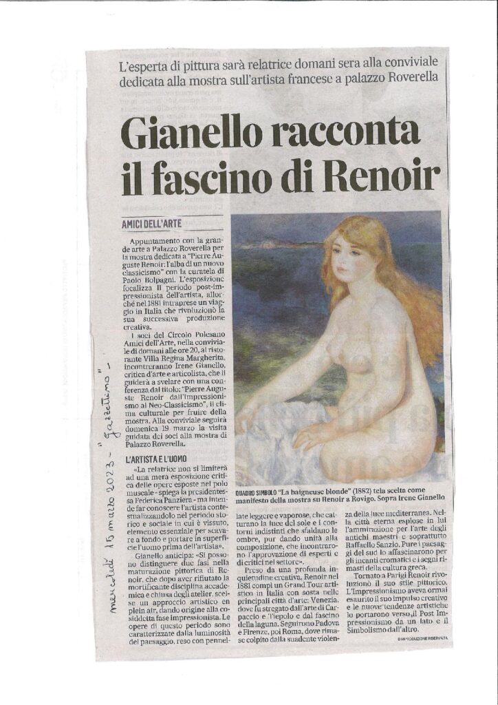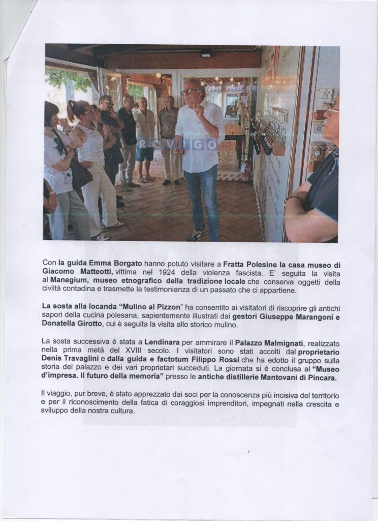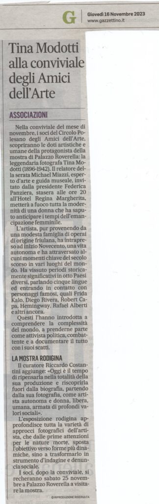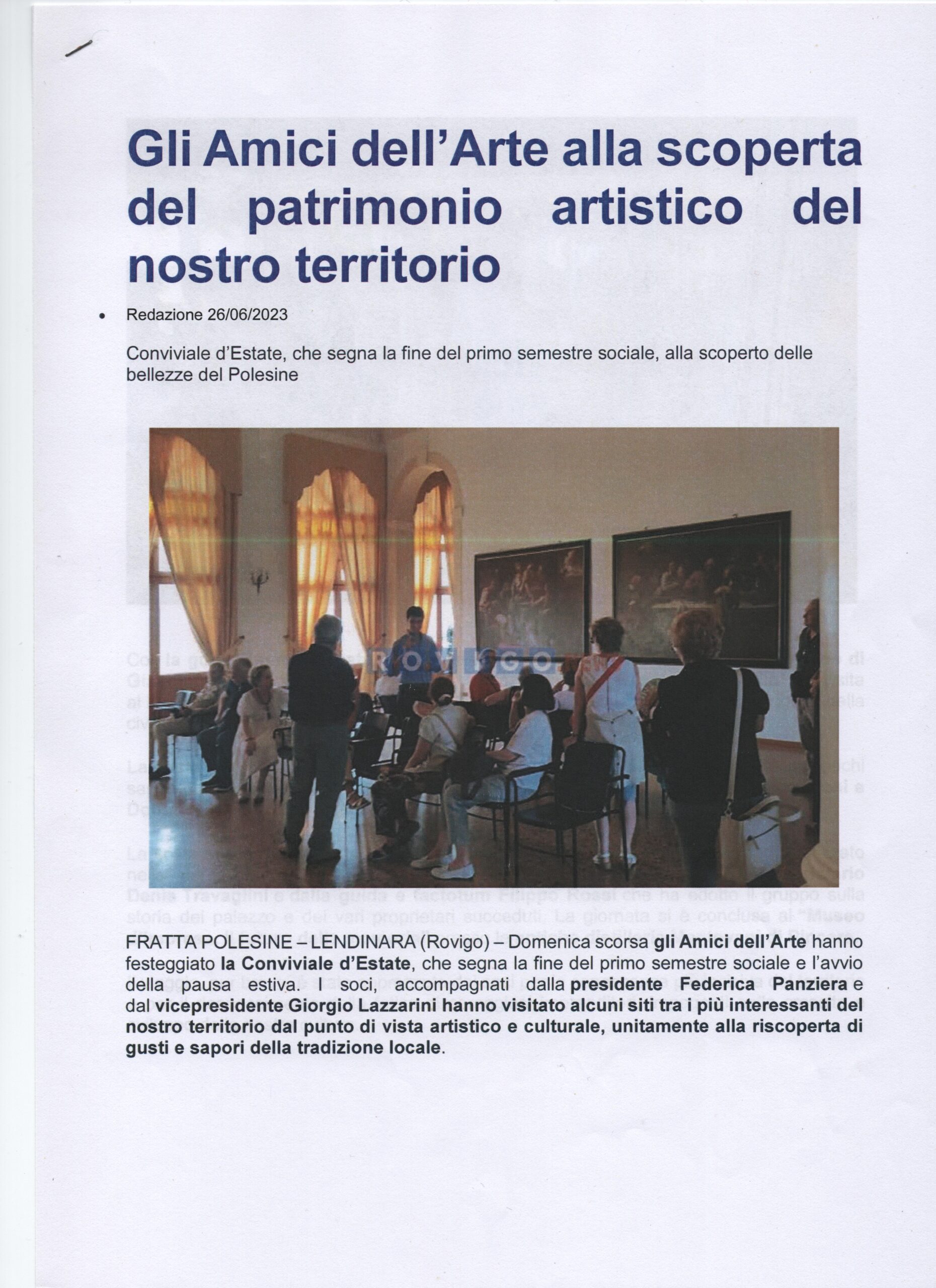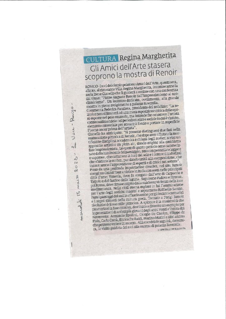 26-06-2023 Rovigo oggiConviviale di settembre 2023 “L’arte del vetro”. Relatore il maestro Sandro Tomanin- La Voce di RovigoLocandina della Mostra del Circolo Amici dell’Arte – ottobre 2023Presentazione della Mostra dell’ottobre rodigino. Pescheria Nuova Titolo “L’Arte grafica del Novecento Polesano. Curatore Alfredo Sigolo. Gazzettino