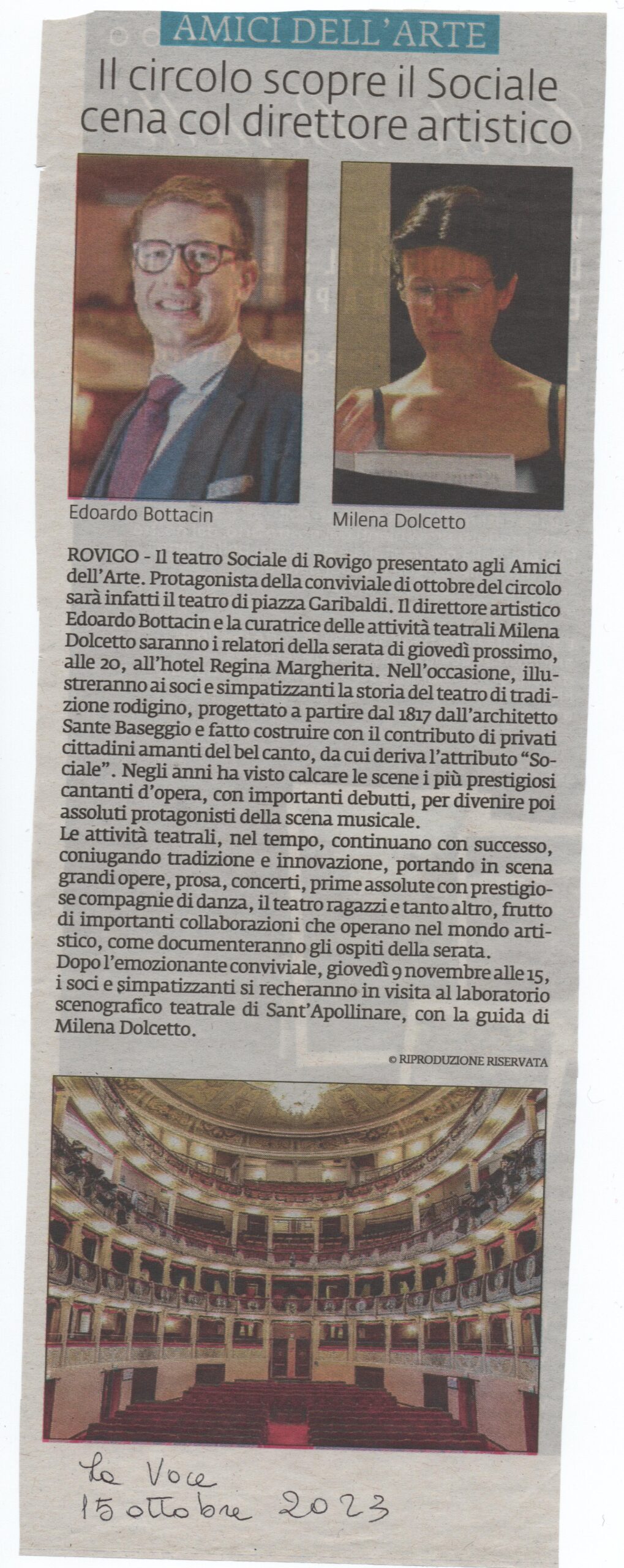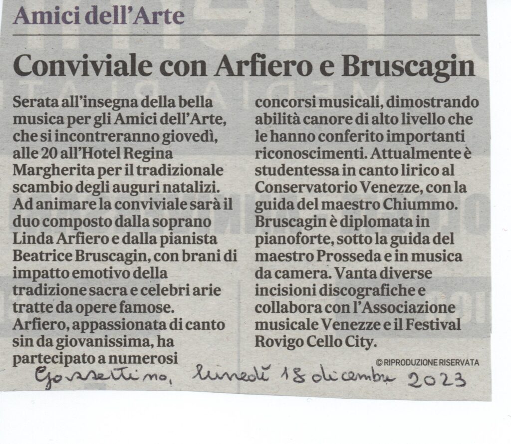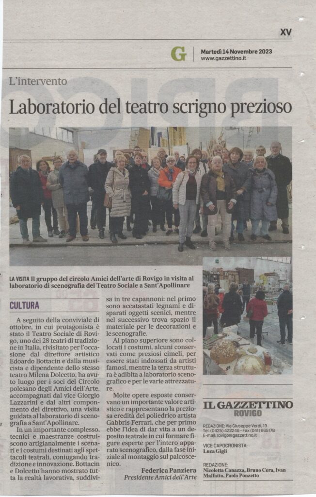 Visita guidata al laboratorio del Teatro Sociale di Rovigo. Accompagnatori Edoardo Bottacin e Milena Dolcetto. GazzettinoGli Auguri natalizi del CircoloOspite della serata -la pianista Beatrice BruscaginAltra ospite: la soprano Linda Arfiero