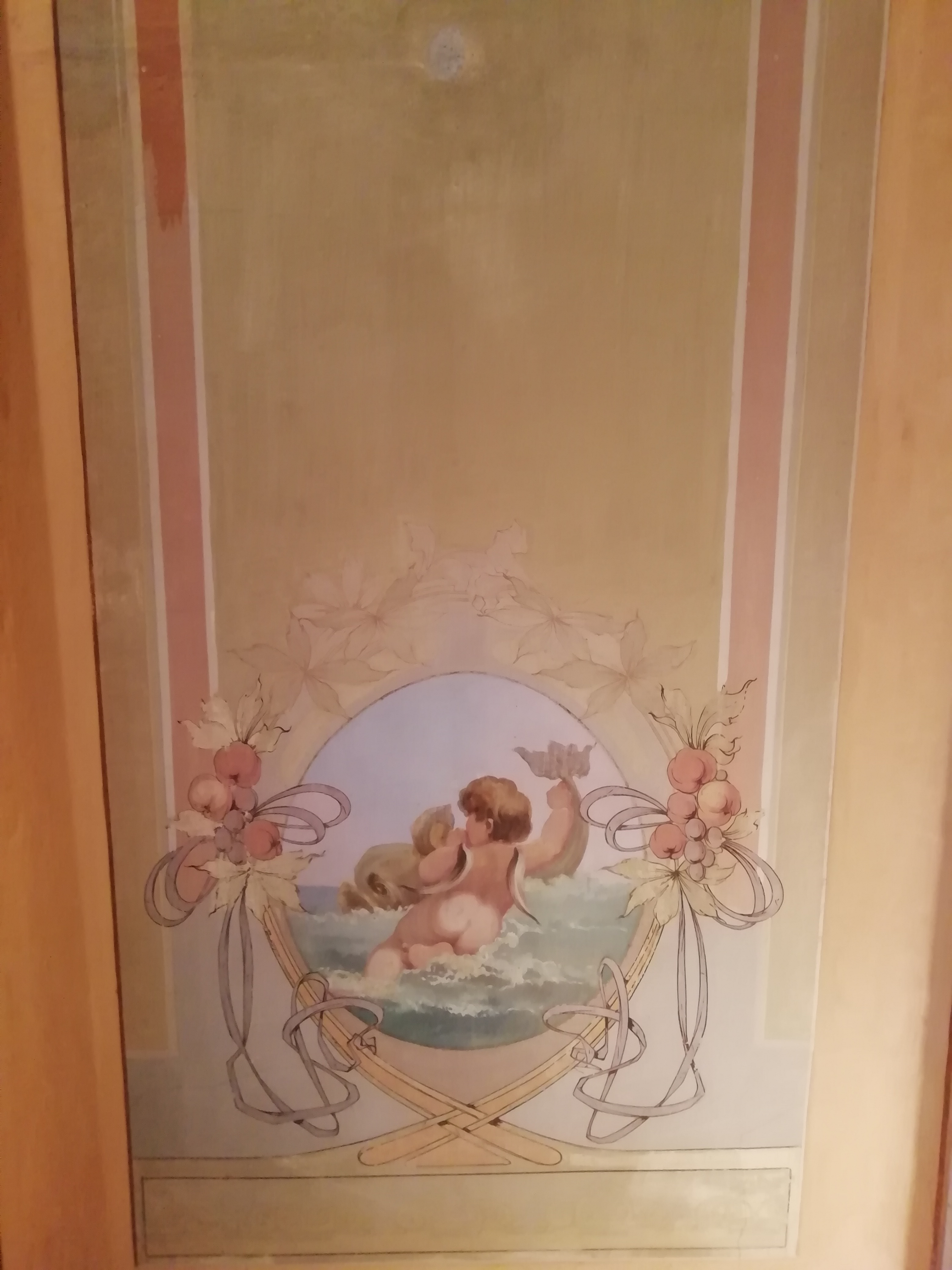 Il soffitto è caratterizzato da una trabeazione, che lo suddivide in tre parti: nella parte centrale sono presenti due fondi ovali su di un paesaggio marino. Nel primo è raffigurato un amorino con un delfino che suona una conchiglia e nel secondo appare lo stesso amorino, visto di spalle. Entrambi gli ovali sono impreziositi da intrecci di nastri e di fiori con funzioni decorative, in stretto richiamo allo stile liberty.