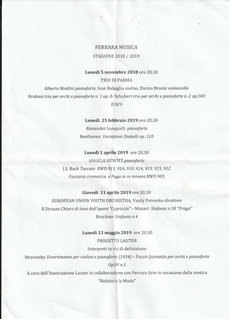I soci del Circolo Polesano degli Amici dell’Arte hanno dato adesione alla stagione concertistica 2018-2019, presso il teatro comunale “Claudio Abbado” di Ferrara.  Il programma proporrà ancora una volta le grandi orchestre, i migliori solisti e i direttori più richiesti del panorama internazionale,  nel solco dell’eredità di Claudio Abbado. Il primo appuntamento per i soci è previsto per lunedì 5 novembre 2018 alle ore 20.30 ( come da programma allegato ).