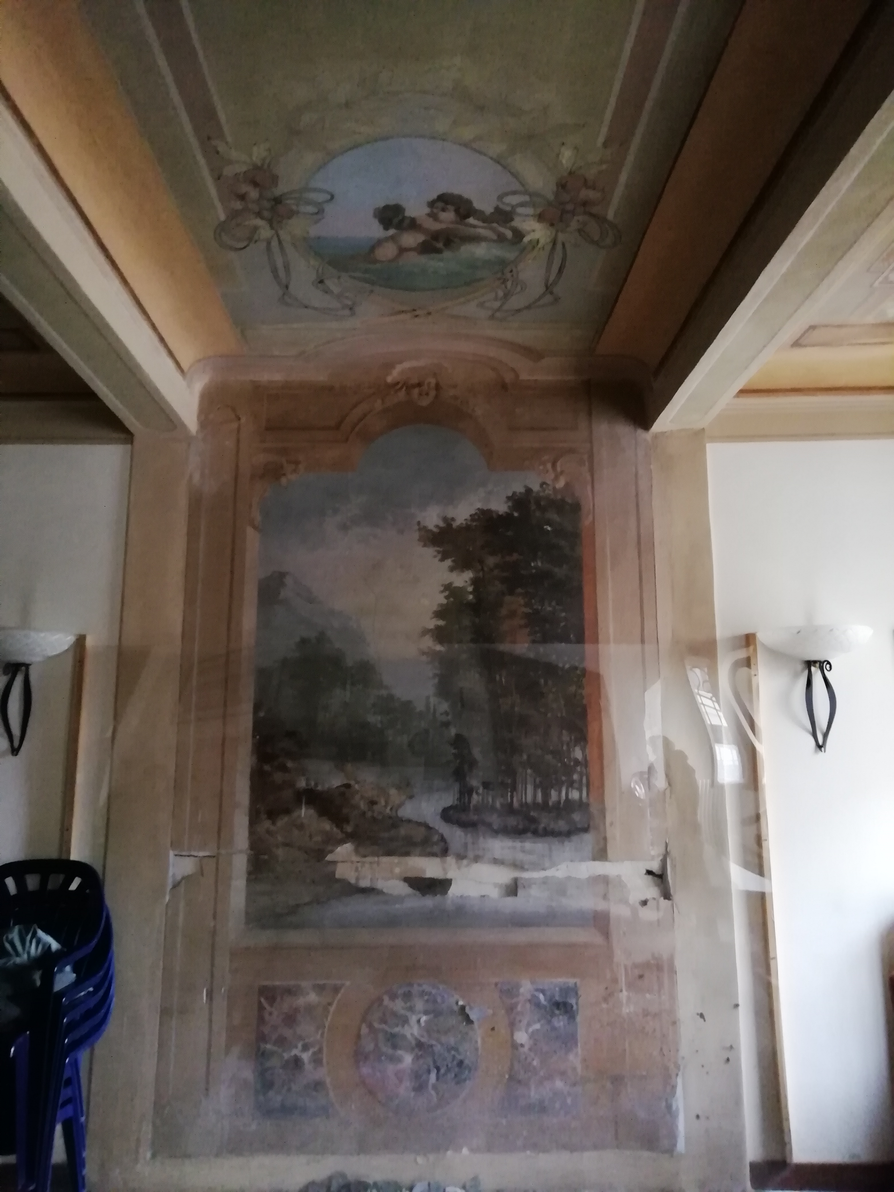. Nella parete, di fronte alla porta di ingresso, si può ammirare un portale in finto marmo, con mascherone in chiave di volta e sotto si apre un paesaggio agreste, in cui due graziose figure di cervi incarnano una visione vitalistica del mondo.