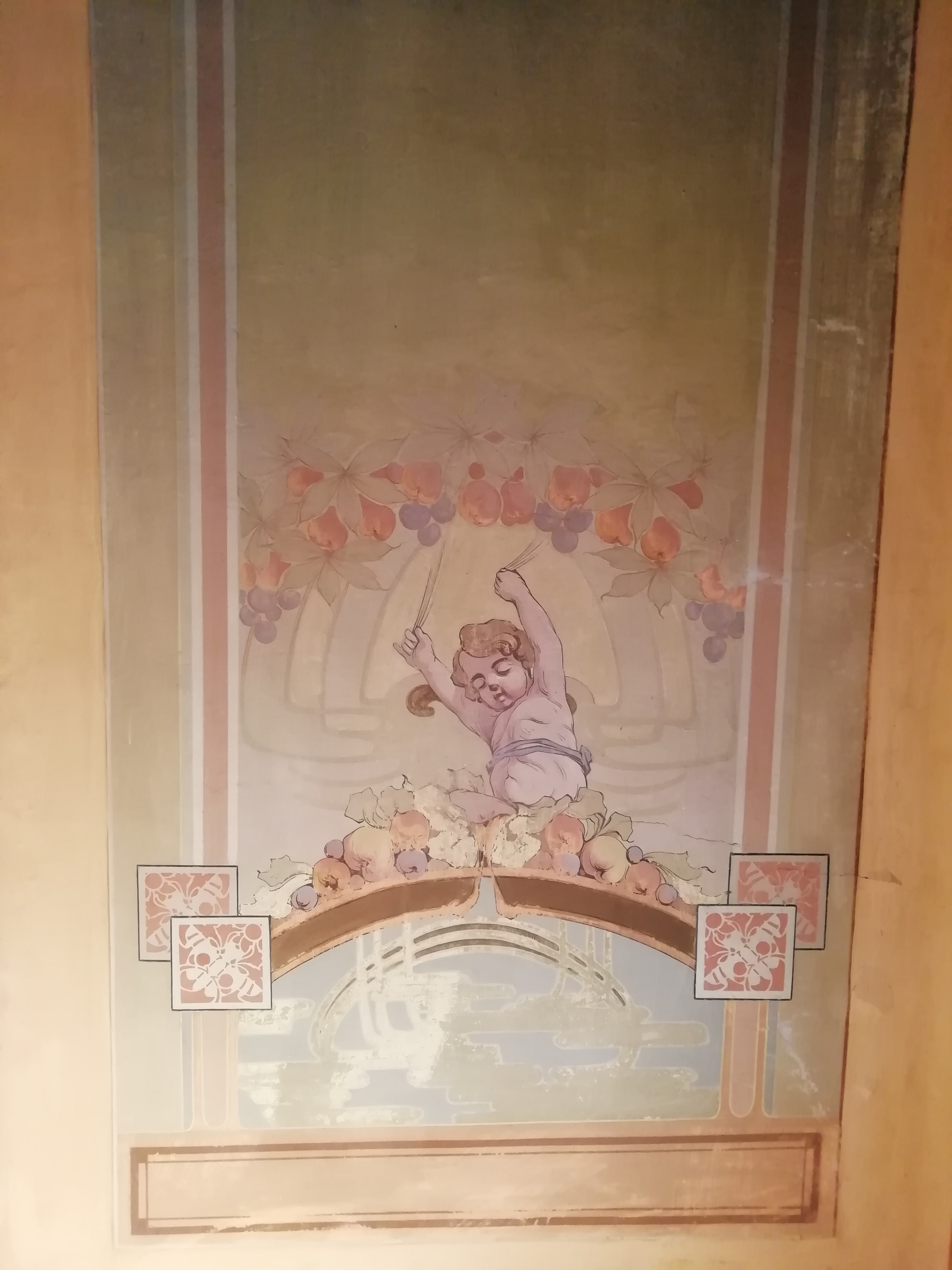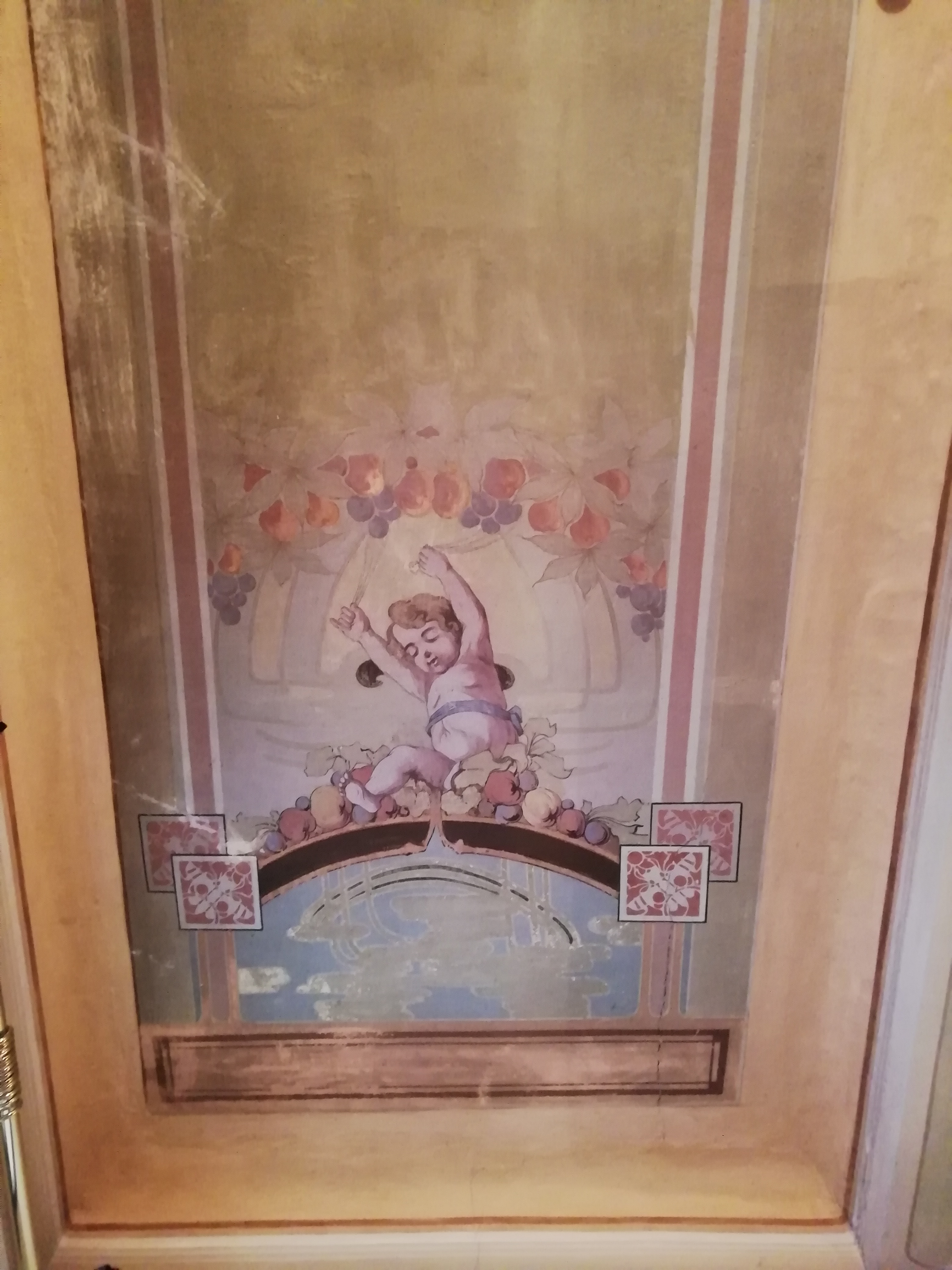 Si può osservare un richiamo allo stile Liberty, evidenziato da una accentuata eleganza decorativa, con linee dolci e sinuose del mondo vegetale, combinate a elementi di fantasia. Il prezioso soffitto è caratterizzato da una trabeazione che lo suddivide in tre parti e in ognuna sono raffigurati amorini inseriti in ovali, impreziositi da intrecci di nastri e di fiori con funzioni decorative, in stretto richiamo allo stile in voga a fine ottocento e primo ventennio del novecento